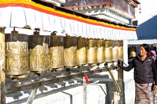 ラサの街を歩くと、特にポタラ宮、ジョカン寺(大昭寺)(大昭寺)、ラモチェ(小昭寺)の周りで、転経器を手に持ち回している多くの人を目にすることができます。転経器はマニ車(マニコロ)とも呼ばれ(マニはチベット語で「宝珠」、コロは「チャクラ:円」の意)、その側面には仏教の陀羅尼(呪文)の1つである六字真言(六字大明呪)が刻まれています。チベット仏教では、この六字真言を唱える回数が多ければ多いほど、観世音菩薩にの敬虔な心を表すこととなり、輪廻の苦から抜け出すことができるとされています。マニ車を右回り(時計回り)に一回転させると経を一回唱えるのと同じ功徳が得られるのだそうです。転経は、決められたルート(遍路)に従って巡礼します。チベット仏教の信教者にとってのチベット・ラサはまさに聖地であり、世界の中心です。ラサでは今日も多くの信徒たちがマニ車を手に巡礼しています。