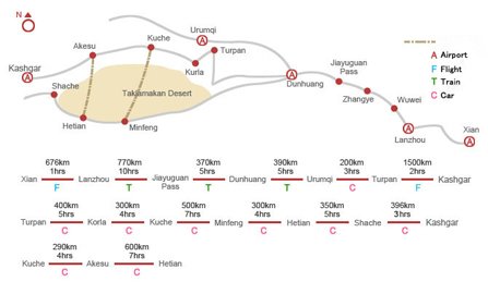 中国の主要都市から西安、蘭州へは中国国際航空、中国南方航空、海南航空が就航しています。ウルムチからカシュガル、ハミ、コルラ、ホータンへは毎日、飛んでいます。チケットは入手しやすく割引料金のものも多くあります。また香港からは毎日、キャセイパシフィック航空とドラゴン航空の便が就航しています。