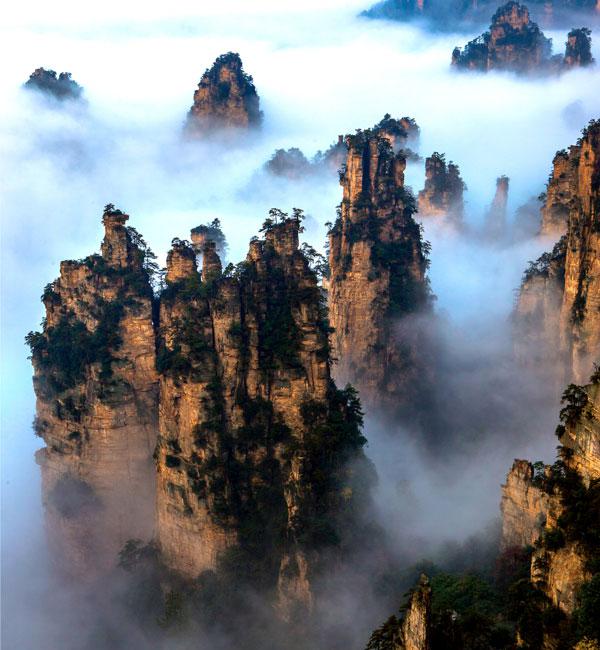 中国湖南省北西部に位置する張家界(ちょうかかい)は、他に類を見ない石英砂岩の奇峰群が織りなす幻想的な風景で世界的に有名な観光地です。特に、3,000本以上もの岩柱が林立するその景観は、映画『アバター』に登場する「ハルーピア山」のモデルとなったことで知られ、世界中の旅行者を魅了し続けています。